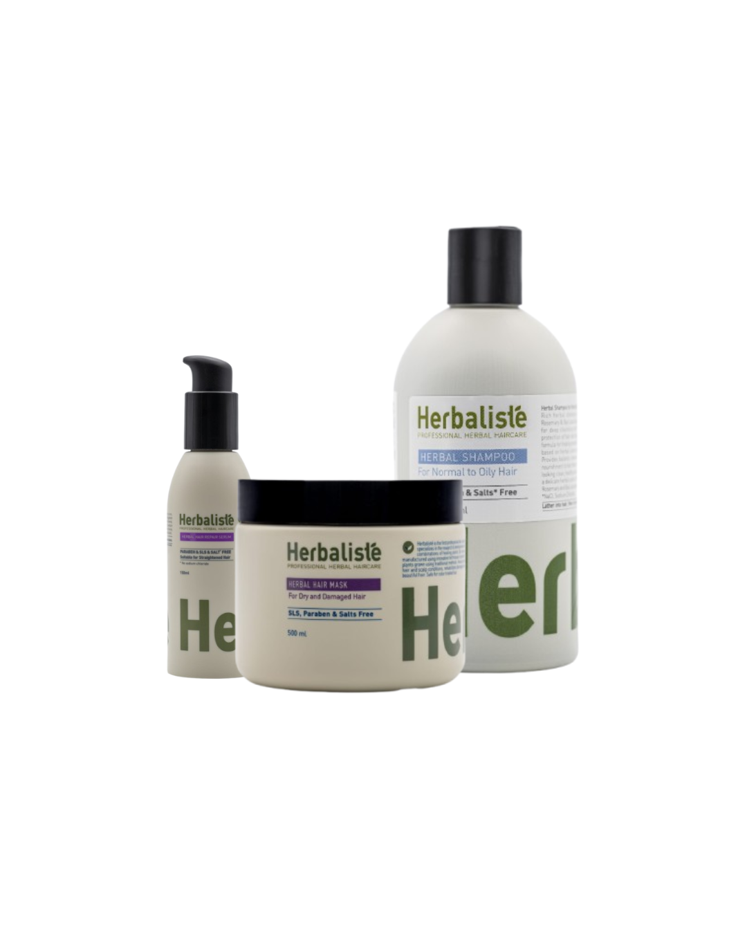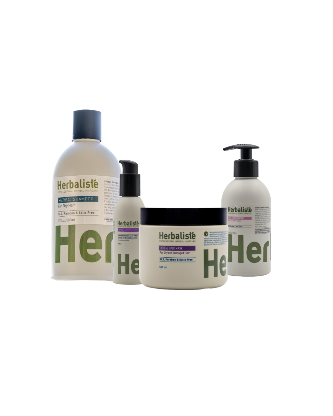 מארז הרבליסטה הכולל שמפו לשיער יבש, מסכה, מרכך וסרום להזנה ושיקום, לרכות וברק שמרגישים כבר מהחפיפה.