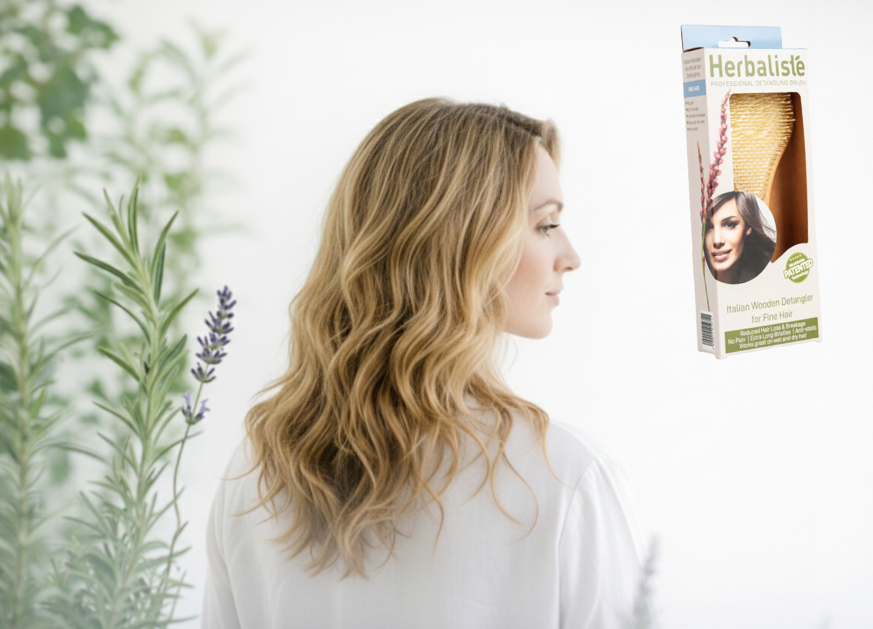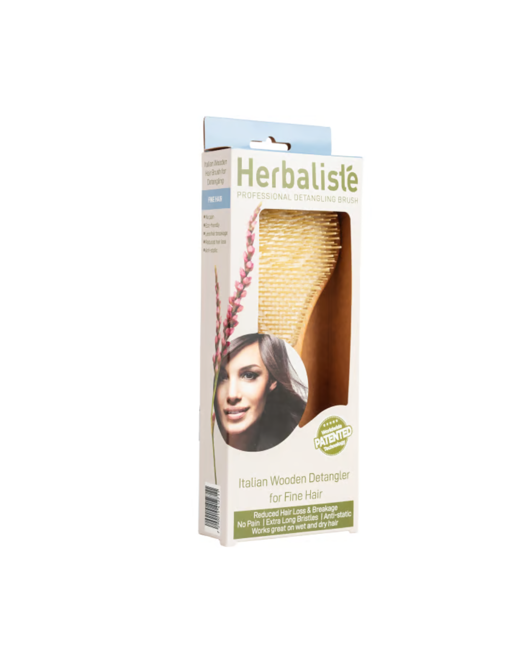 מברשת עץ מקצועית מבית Herbalisté להתרת קשרים בעדינות, עם טכנולוגיה מוגנת פטנט ומבנה זיפים ייחודי שמיועד לשיער עדין.