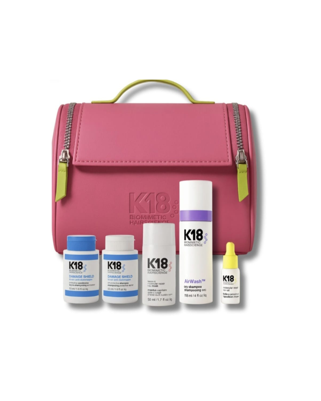 מארז K18 עם מוצרי מיני לשיקום, טיפוח ורענון השיער, כולל שמפו, קונדישינר, מסכה, שמפו יבש, שמן לשיער ותיק ממותג במתנה.