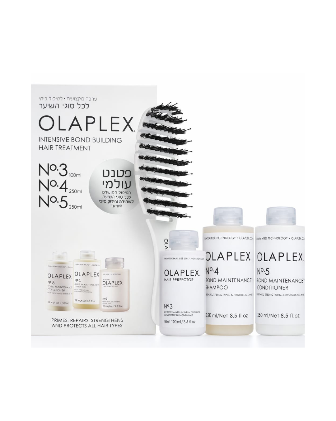 מארז OLAPLEX עם No.3, שמפו No.4, מרכך No.5 ומברשת מתנה – לשגרת טיפוח ביתית לשיער יבש, פגום או שעבר טיפולים.